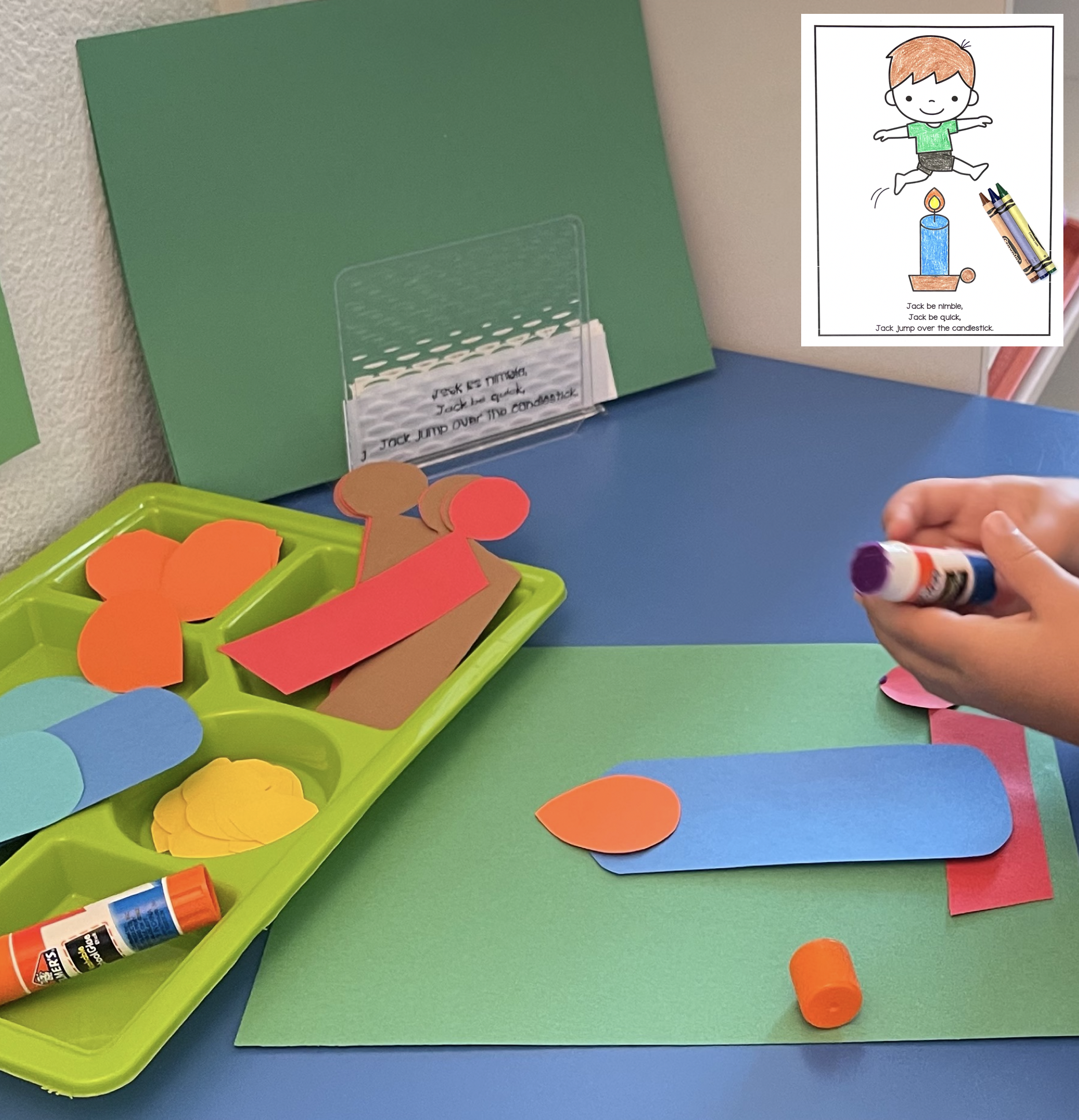 Our first poem is Jack Be Nimble. We have a small battery operated candle that we practice jumping over while we recite the poem. We also make this craft to add to our poetry book.