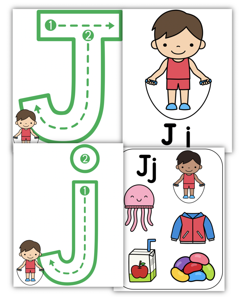 Decorate your classroom with these visuals for your students. The beginning sounds posters will encourage students to connect words and sounds with real objects. The letter formation posters will help your students learn to write and recognize the letter j/J.